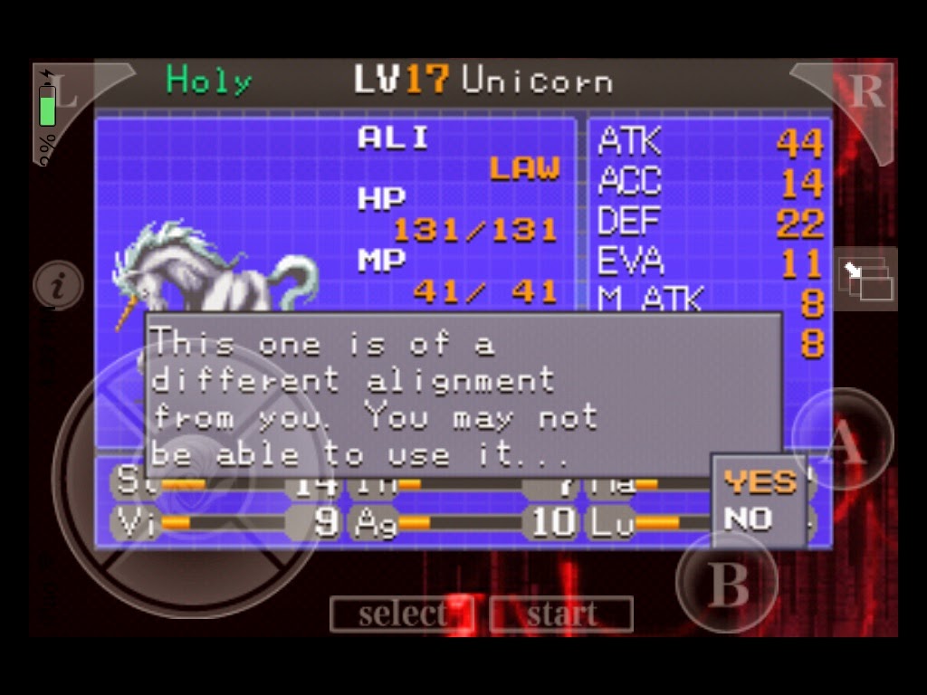 I recruit Beast Tan-ki and Fairy Gandharva, then fuse them into Holy Unicorn. Unicorn is a Strength-oriented demon with Hama and Penpatra for support and a mean Extra skill. He also reflects Expel and nulls Curse, but as Mido observes the Law-aligned demon won't be usable without shifting my alignment. He's really here as an intermediary step in the fusion process.